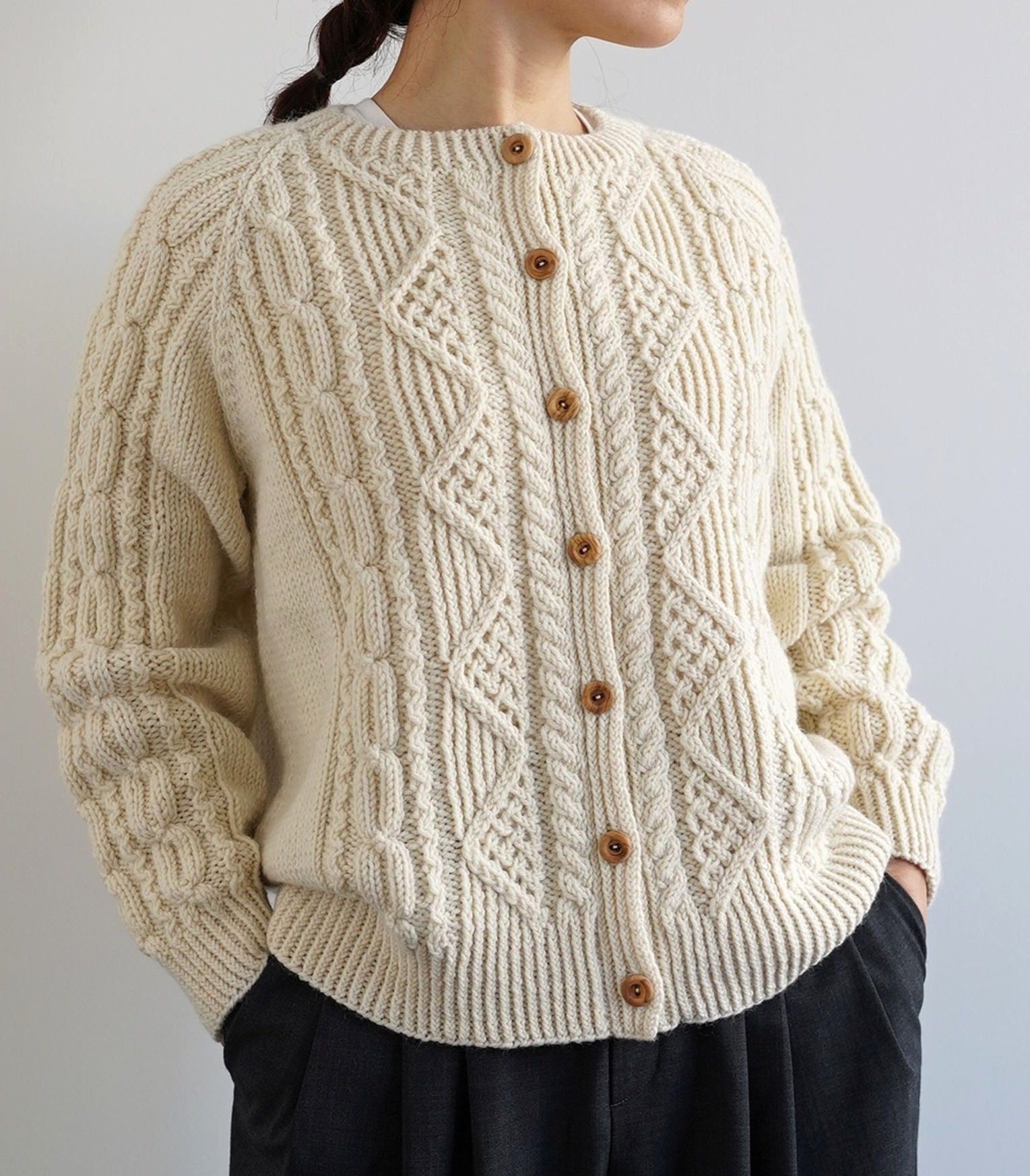 ジグザグとケーブル模様を組み合わせた、立体感が美しいカーディガン。