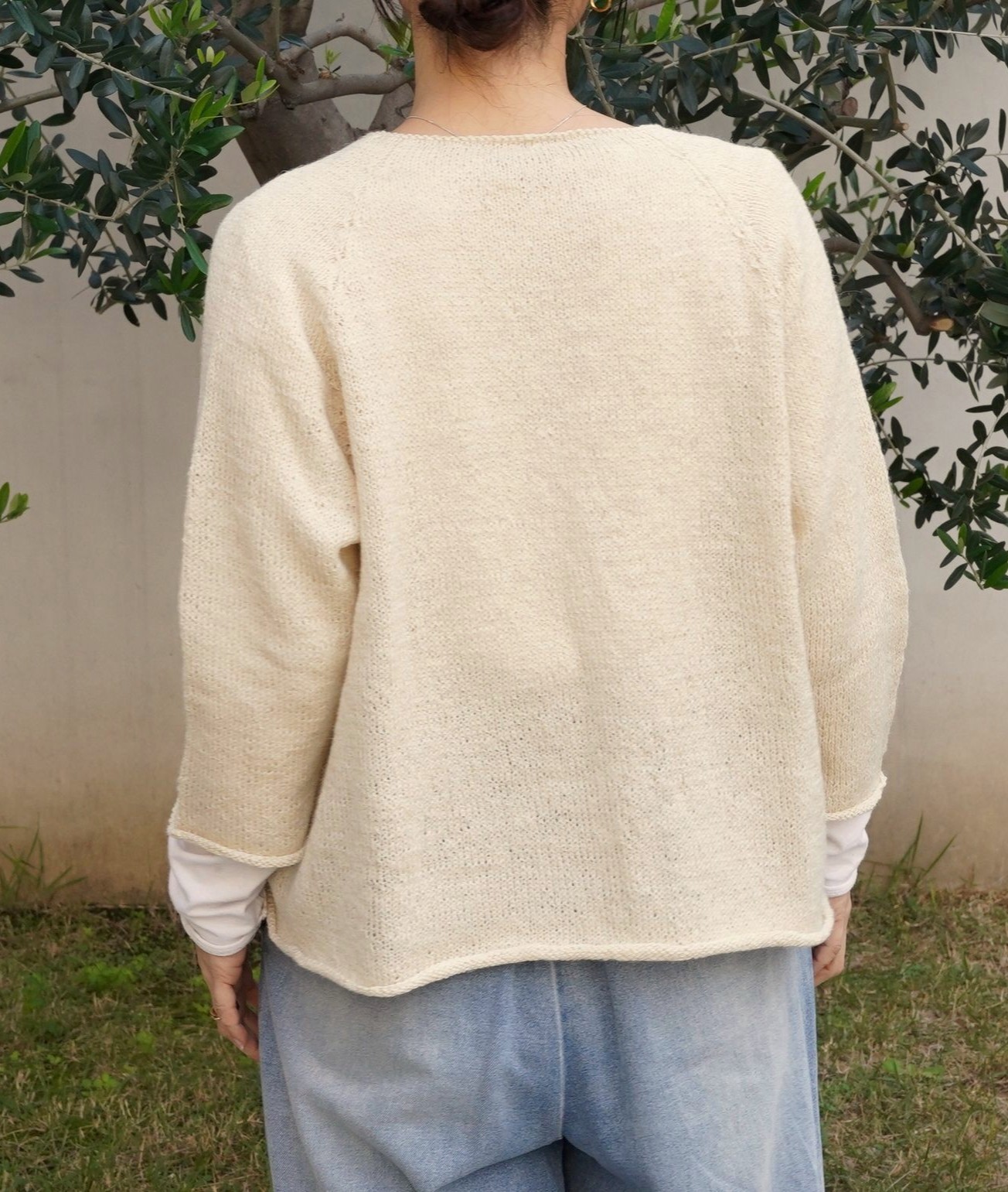メリヤスベースのシンプルな編み地なので、ラグラン部分や衿ぐりの細かな仕立てがより際立ちます。裾と袖口は編みっぱなしの編み地で自然にクルンと丸まり縁取りのような仕立てに。