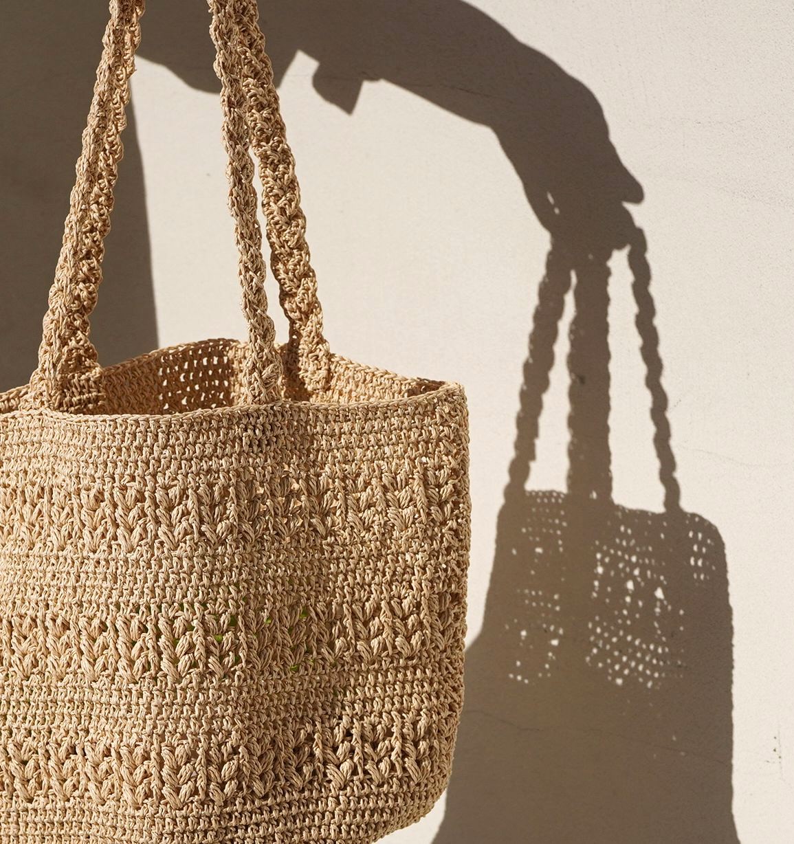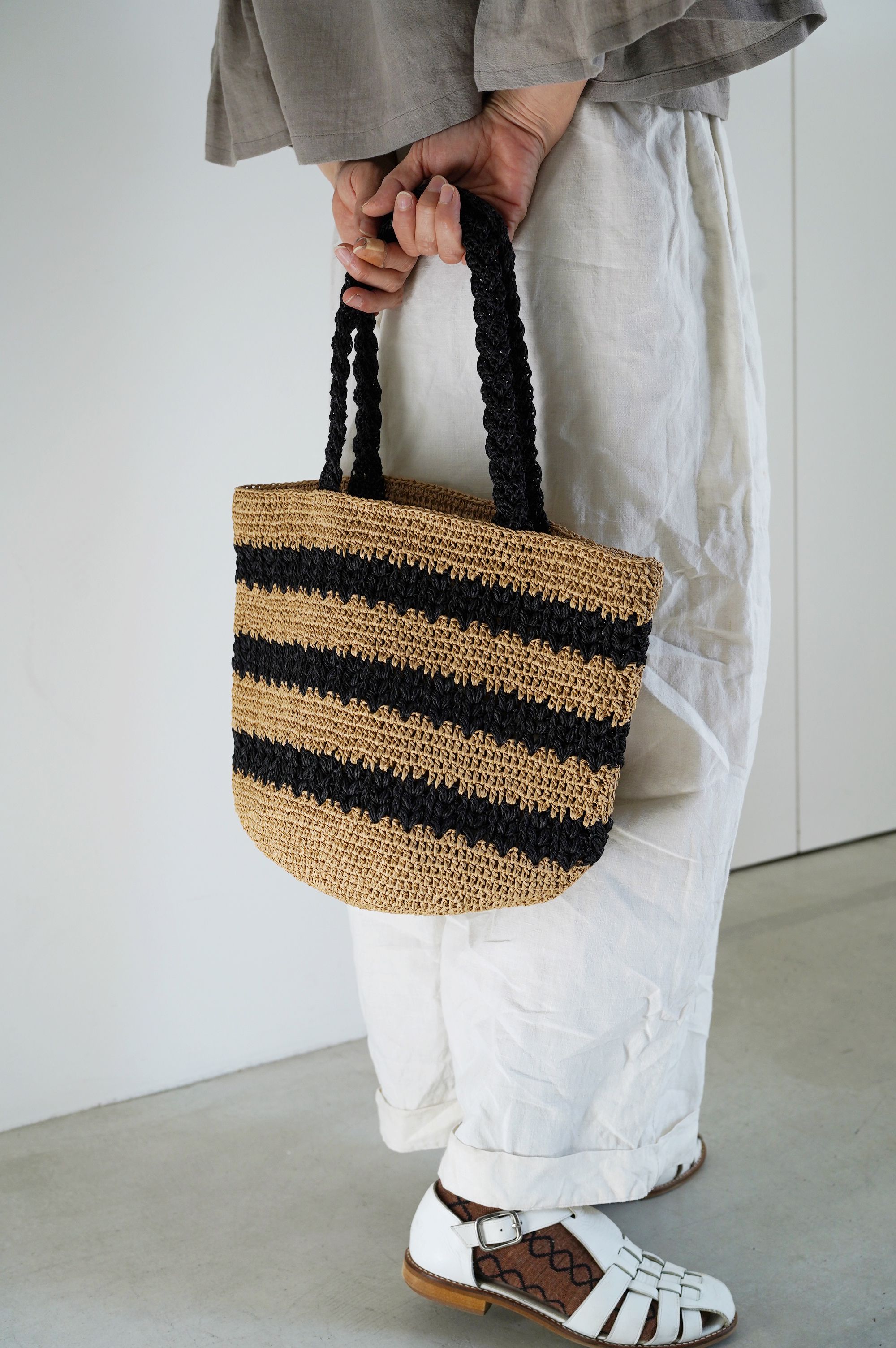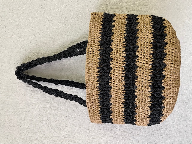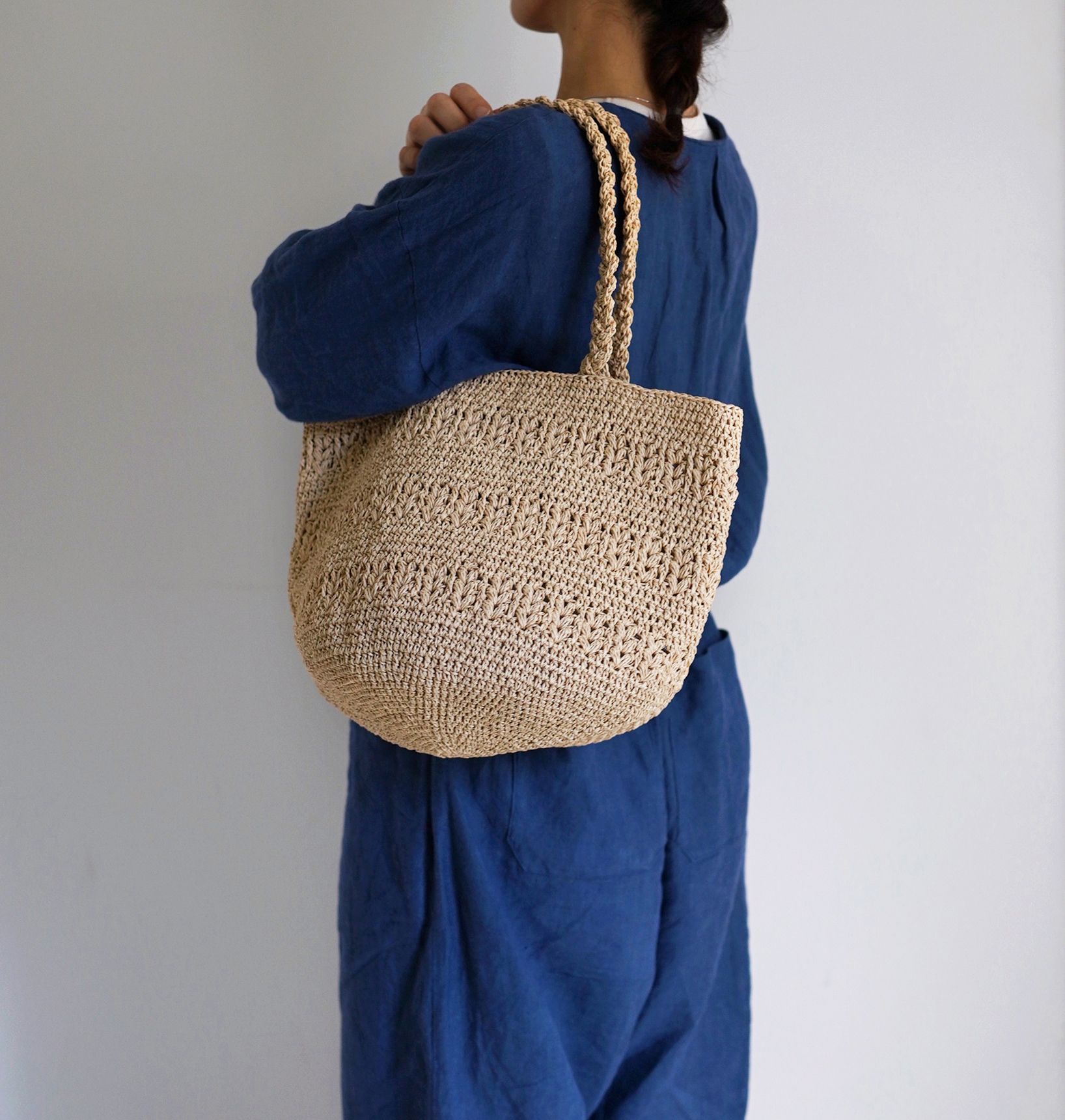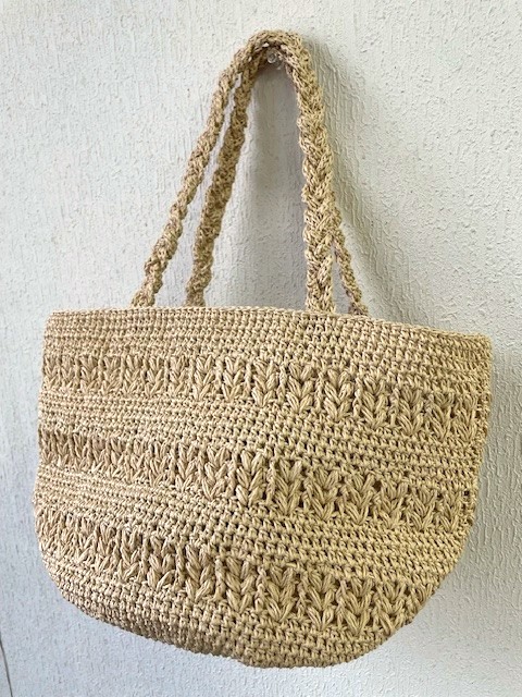 SASAWASHI で編む透かし模様がポイントのバッグです。バッグ底の中心から円を描きながら編むマルシェ型で物がたっぷり入ります。サイド部分にボーダーラインのように透かし柄を入れたデザイン。持ち手は細長く編んだ編み地を三つ編みにして仕立てます。単色で編めばかわいらしくも大人っぽい仕上がりに、2色の配色で編めばカジュアルで夏のコーディネートが映えるバッグに。