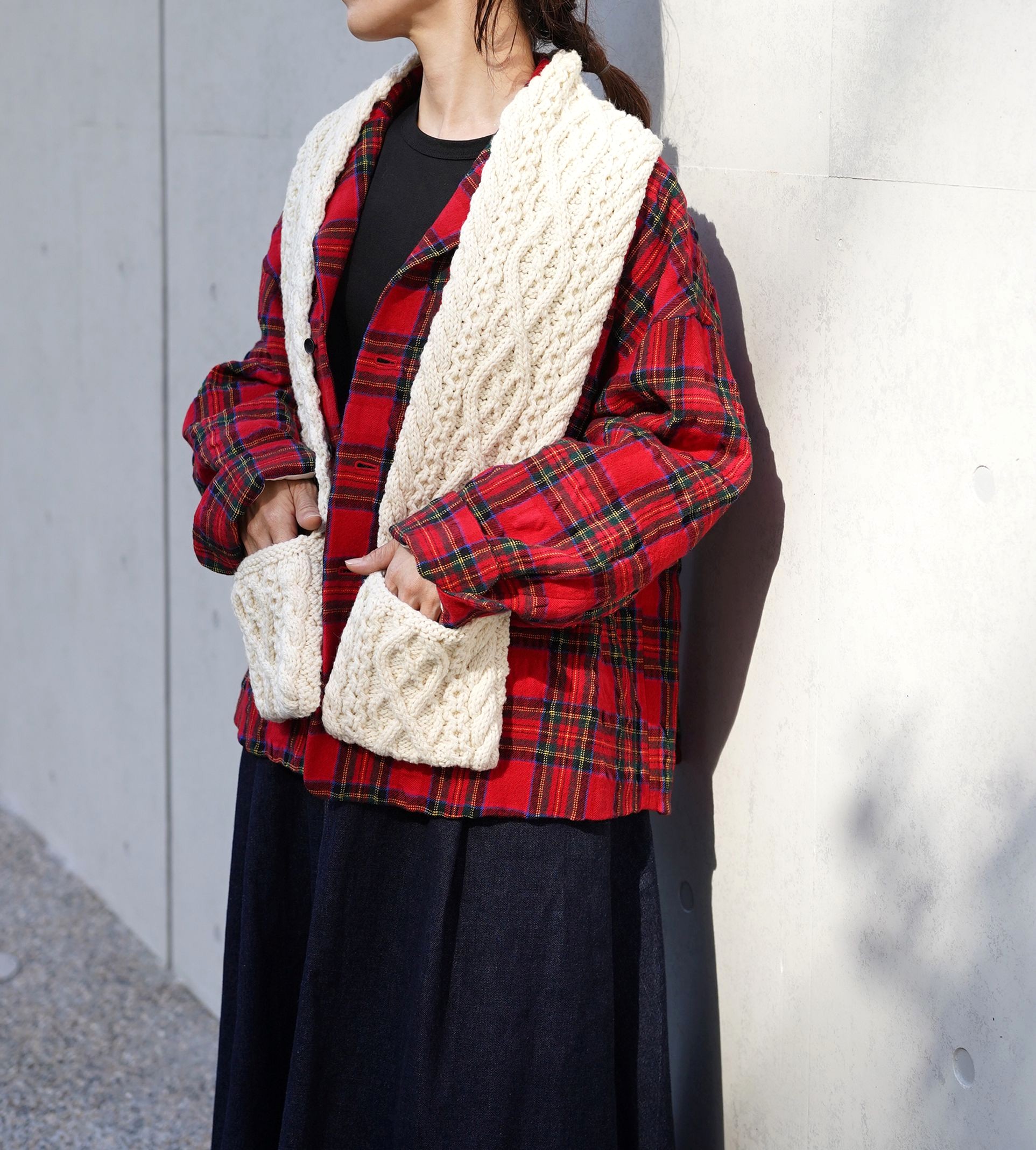 両端にポケットが付いた立体模様が美しいマフラー。