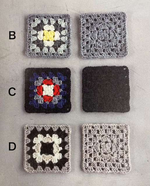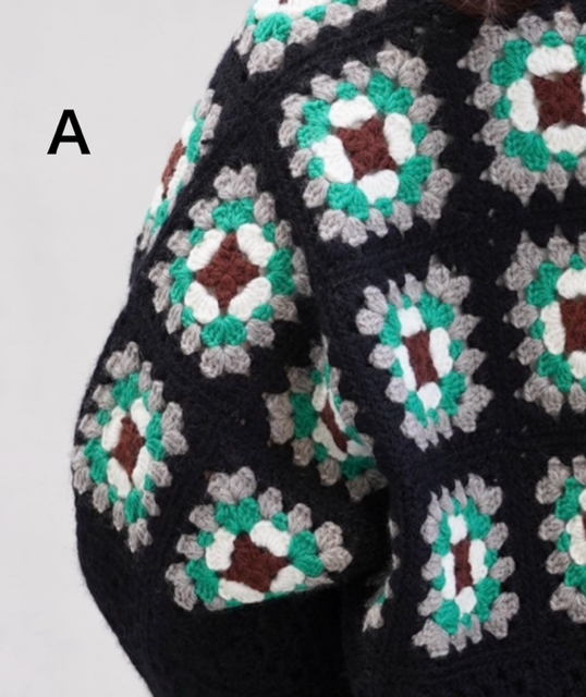 カラフルに配色したモチーフは胸上部分に配置し、単色モチーフは袖下と裾に配置することで、モチーフ編み特有の素朴な温かみを感じながらも普段使いしやすいデザイン。