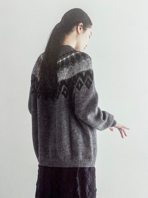 衿からトップダウンで編み、後ろ中心部分に引き返し編みを入れて前後差を出してからヨークに進みます。グルグルと浮き出る模様を楽しみながら‘‘わ‘‘で編みます。同じく身頃と袖も‘‘わ‘‘で編むとじはぎのないウエアです。
